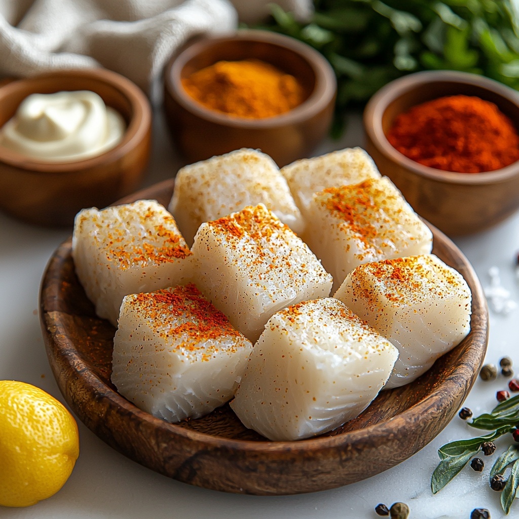 - Dredge the Fish: In a large bowl, whisk together mayonnaise and lemon juice until well combined. Add the white fish fillets to the mixture and toss gently to ensure each piece is fully coated with the mayonnaise-lemon mixture.