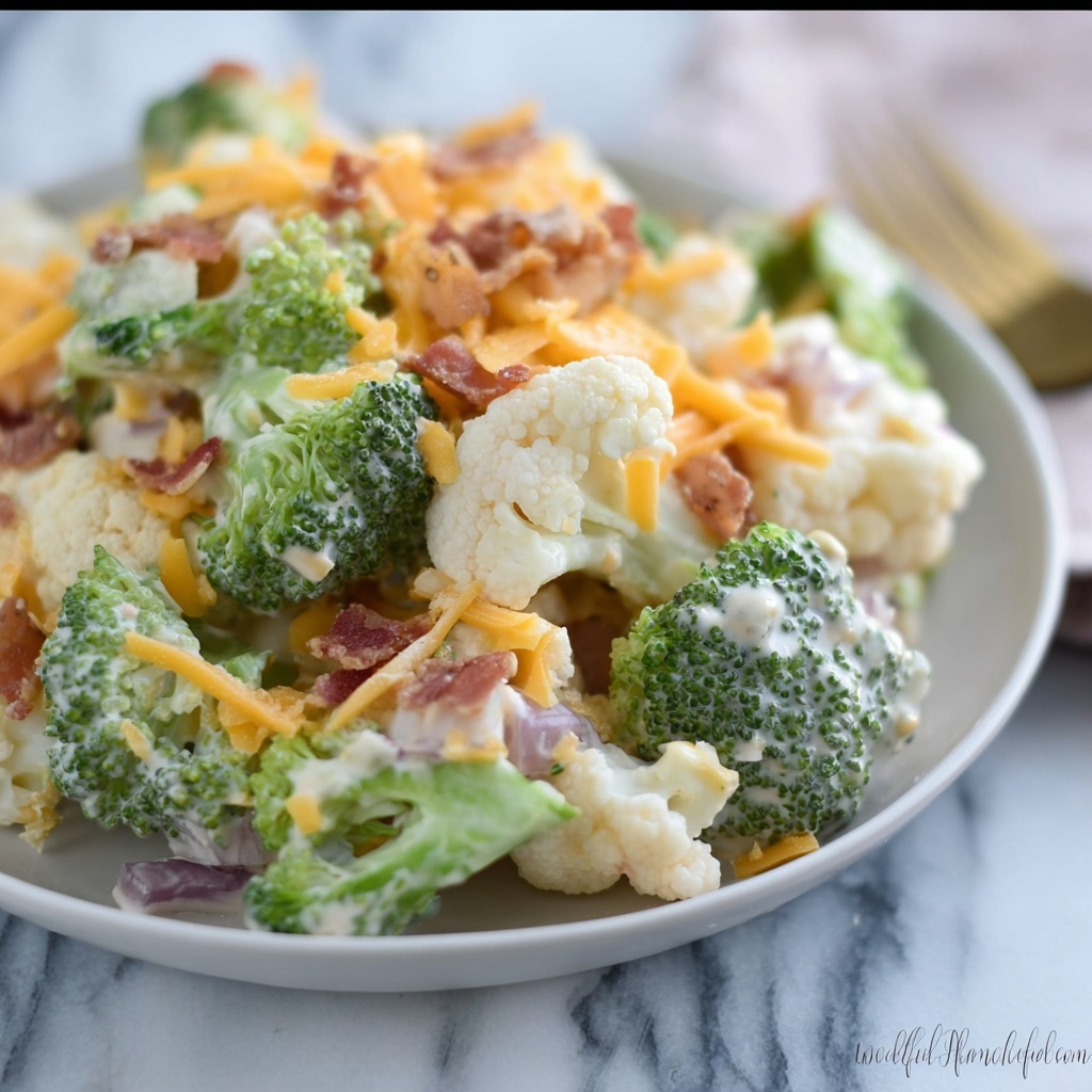 Next, toss the blanched broccoli and cauliflower together in a large bowl with the shredded cheddar cheese, finely chopped red onion, and crispy crumbled bacon. These add-ins transform the salad from simple veggies to a medley of textures and flavors that tease your palate.