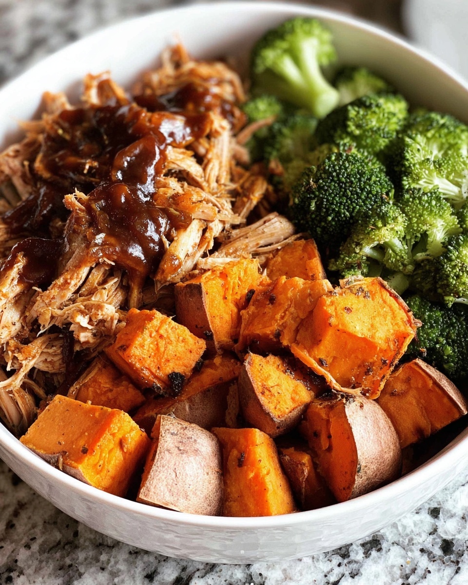 Divide the roasted sweet potatoes, onions, broccoli, and the sauced shredded chicken evenly between your serving bowls. Serve immediately while everything is warm, allowing the flavors and textures to come together perfectly.