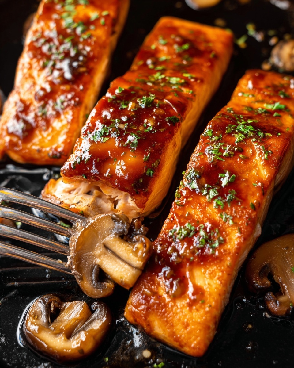 Add the remaining tablespoon of butter to the skillet and let it melt completely. Pour the prepared glaze carefully into the pan, between the salmon pieces, allowing it to bubble and thicken for about 20 to 30 seconds. This brief simmer helps the sauce develop its sticky, shiny finish without burning. Remove the pan from heat and spoon the sauce generously over the top of the salmon.