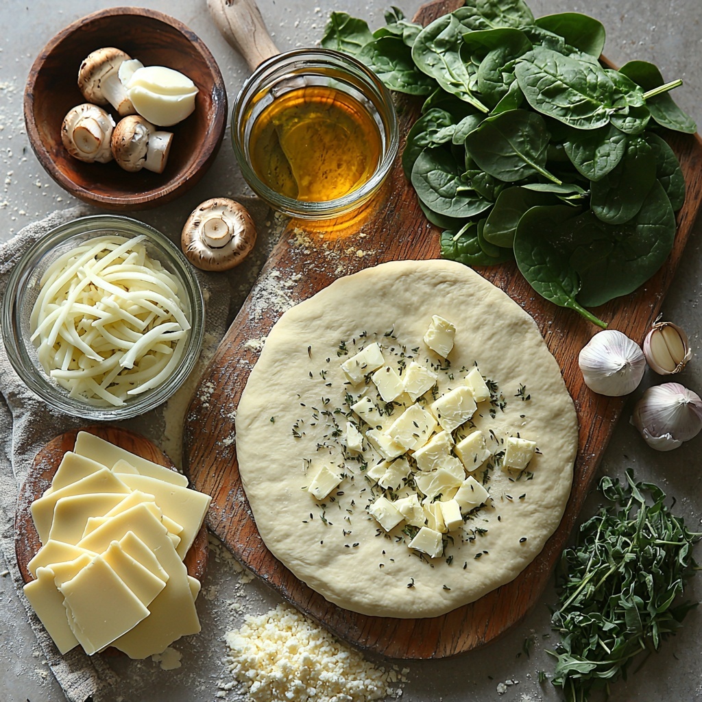 Once the crust is partially baked and slightly cooled, spread the caramelized onion and mushroom mixture evenly over it. Next, layer the fresh baby spinach leaves on top, followed by shredded mozzarella and Parmesan cheeses. These layers of fresh, creamy, and savory toppings promise every bite will be rich and satisfying.
