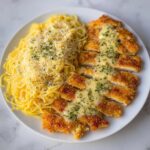 This comforting Chicken Smothered in Cheesy Alfredo Three-Cheese Spaghetti Sauce features tender, breaded chicken breasts pan-fried to golden perfection and served atop spaghetti tossed in a rich and creamy Alfredo sauce made with Parmesan, mozzarella, and sharp cheddar cheeses. Garnished with fresh parsley and extra Parmesan, this hearty dish delivers a perfect balance of crispy chicken and velvety pasta for a delightful weeknight dinner.