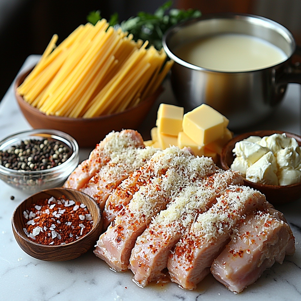 These ingredients are wonderfully straightforward yet essential in building layers of flavor, texture, and that striking golden color that makes this dish so inviting. Each component plays a special role in bringing this Cheesy Alfredo Chicken over Three-Cheese Spaghetti Recipe to life in your kitchen.