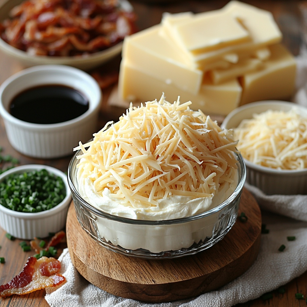 - Add Flavorings and Fillings: Stir in a dash of Worcestershire sauce, caramelized onions, 1 ¾ cups of shredded Gruyère cheese, 2 tablespoons of chopped fresh chives, and the crumbled cooked bacon. Mix until all ingredients are evenly incorporated.
