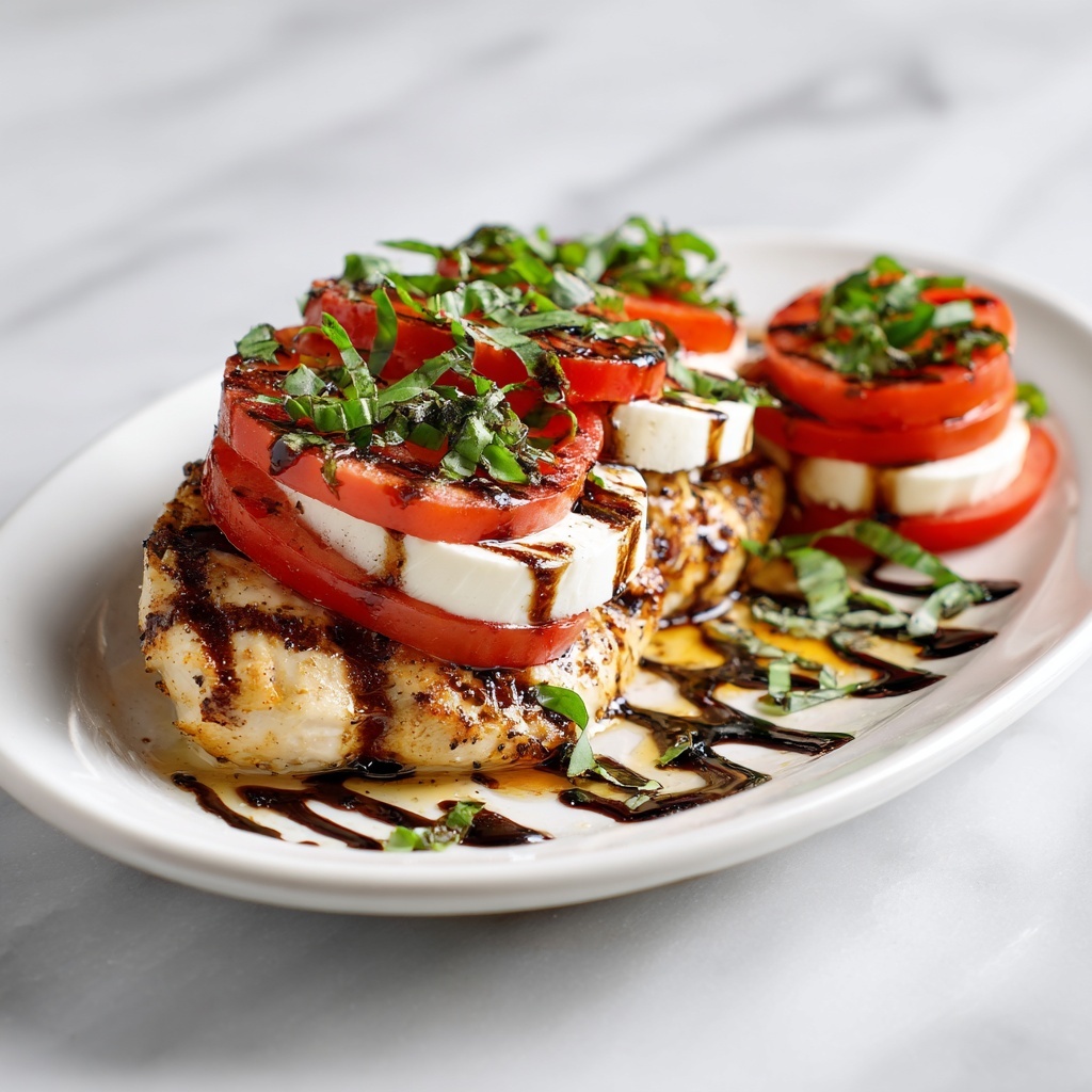 Remove the grilled chicken onto a serving plate and immediately top each piece with thick slices of fresh mozzarella and 1 to 2 slices of the tomato and basil mixture. Sprinkle on a few more basil slices for that garden-fresh aroma and a drizzle of balsamic glaze if you’re aiming for a restaurant-quality finish. Let the assembled chicken rest for about 5 to 10 minutes—this allows the cheese to slightly melt and the flavors to marry beautifully.