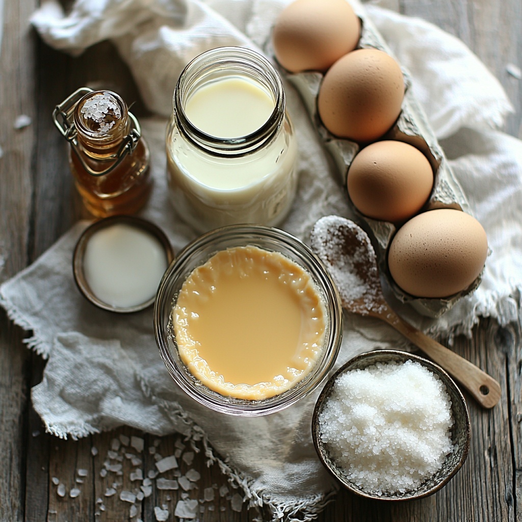 - Prepare Custard Mixture: In a blender or mixing bowl, combine sweetened condensed milk, evaporated milk, heavy whipping cream, vanilla extract, eggs, and sea salt. Blend until the mixture is smooth. For extra smoothness, strain the mixture through a fine sieve if desired.
