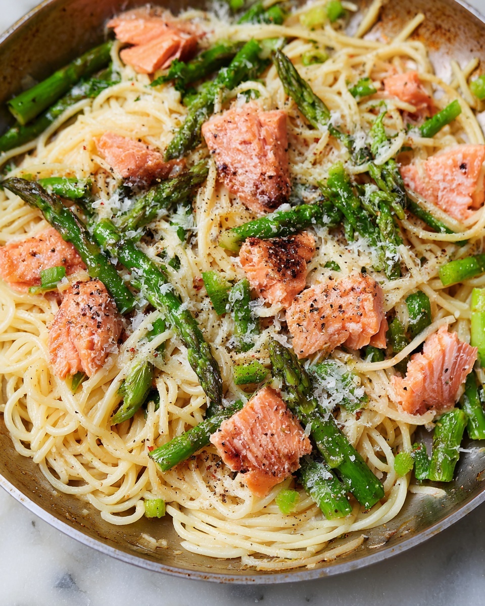For a stunning presentation, you can plate the pasta in neat nests on warm plates, topping each with a few larger flakes of salmon and asparagus tips. Drizzle a little extra lemon zest and olive oil over the top for shine and a fresh fragrance boost. Serving family-style in a colorful serving dish gets everyone excited to dig in together.