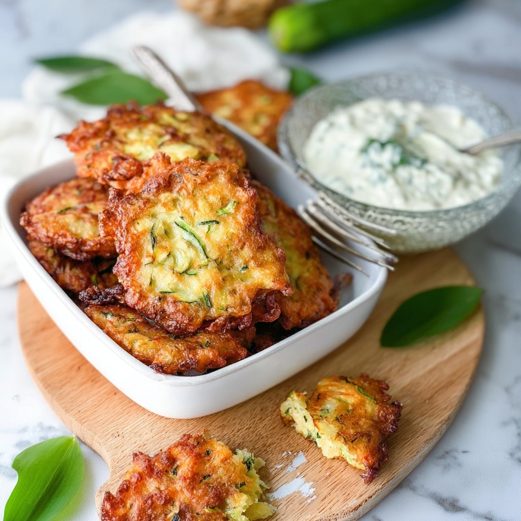 A delicious and easy-to-make recipe for Crispy Zucchini Fritters that are golden on the outside and tender on the inside. These fritters combine shredded zucchini with creamy ricotta, Parmesan cheese, fresh herbs, and a touch of seasoning, pan-fried to perfection and served with a tangy garlic dill yogurt sauce.