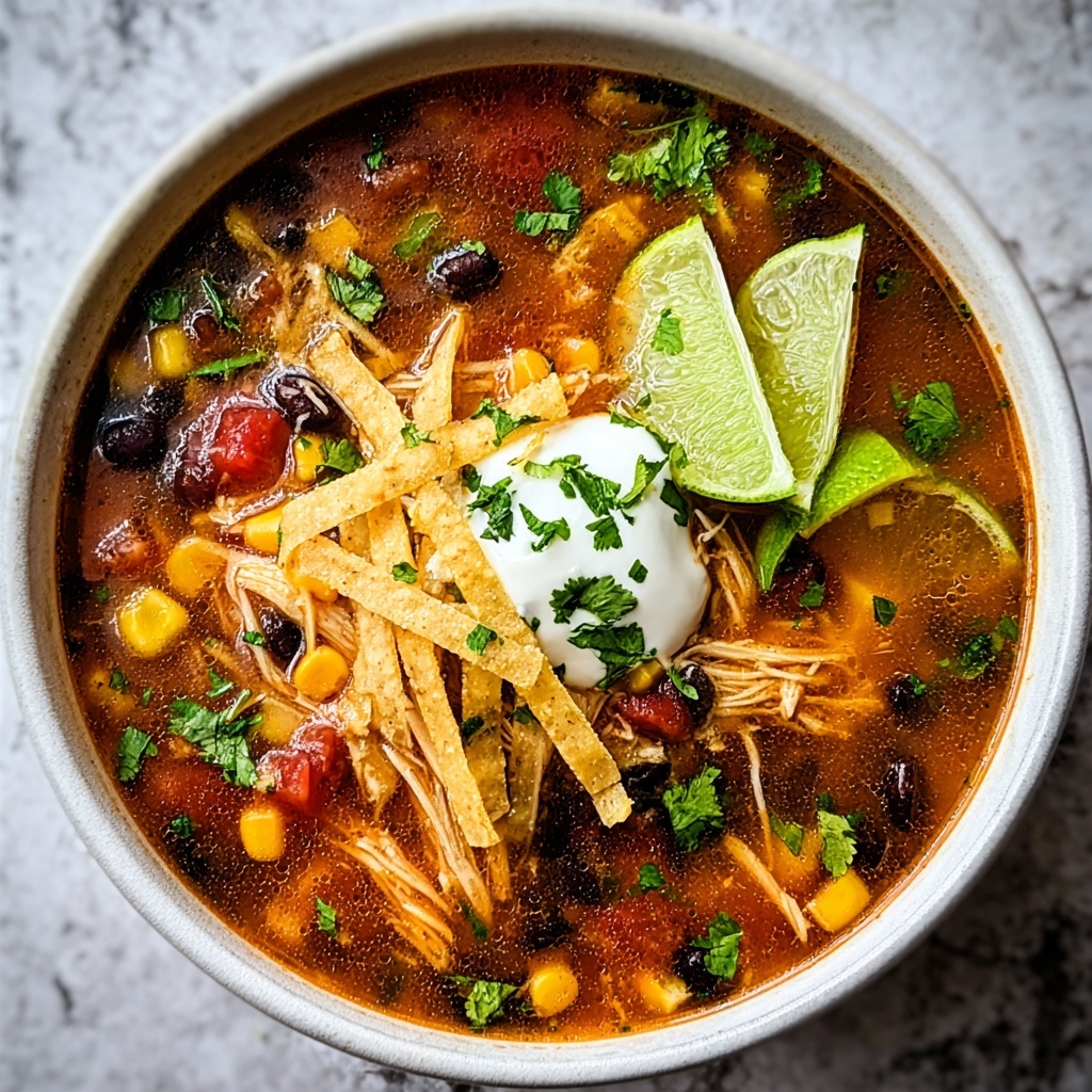 This hearty Crock Pot Chicken Tortilla Soup is a flavorful and comforting slow-cooked meal perfect for busy days. Tender chicken breasts are simmered with enchilada sauce, diced tomatoes with green chilies, black beans, corn, and spices in a crock pot to develop rich, Mexican-inspired flavors. Fresh lime juice and cilantro brighten the soup, and optional toppings like shredded cheese, sour cream, avocado slices, and crunchy tortilla strips add layers of texture and taste.