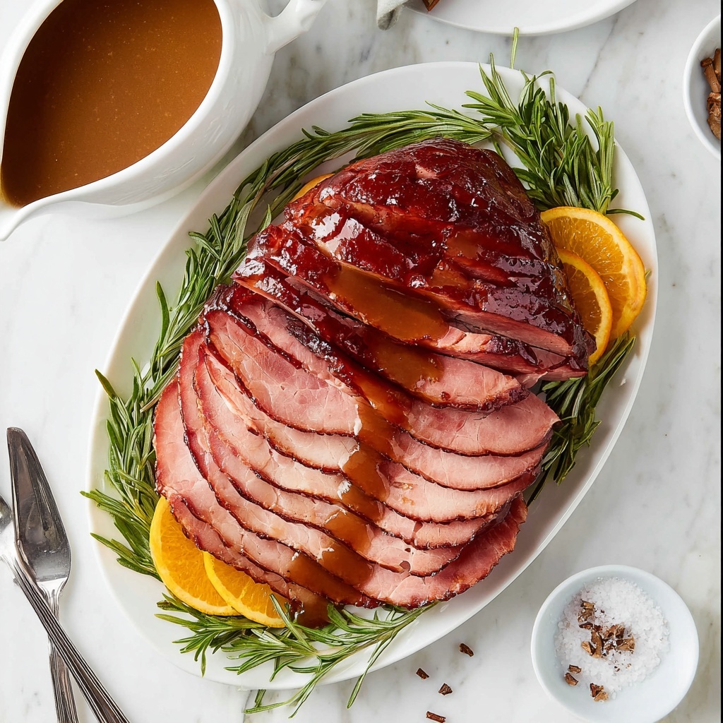 To elevate the presentation and bring out the glaze’s inviting hues, consider garnishing your ham with a sprinkling of fresh herbs like thyme or rosemary. Orange slices arranged on the serving platter echo the citrus in the glaze and add vibrant color. For a festive touch, stud the ham lightly with whole cloves before serving for that classic holiday look and warm spice scent.