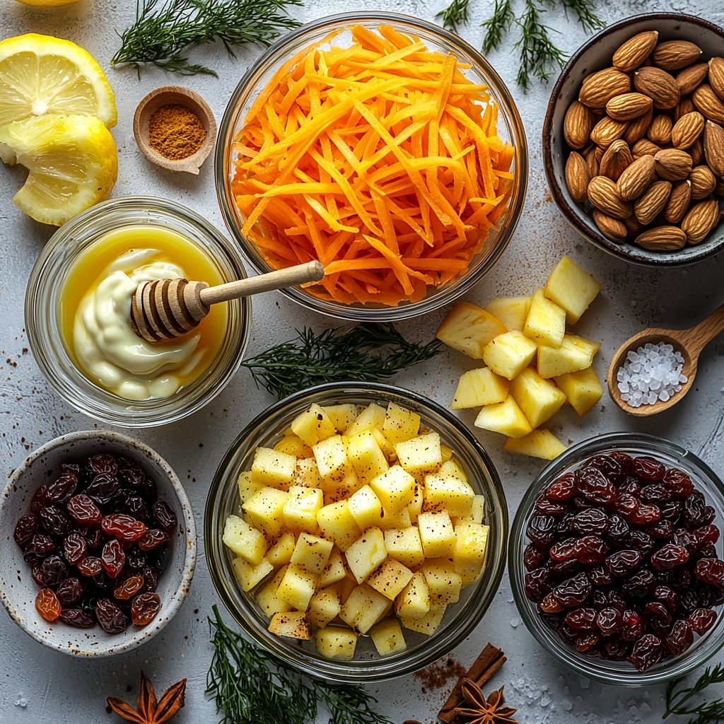 To whip up the Delicious Carrot Raisin Salad – Quick, Healthy & Refreshing Recipe, you’ll want just a handful of straightforward ingredients that pack a lot of character. Each component is chosen for its special role, from adding creaminess and sweetness to delivering crunch and bright flavors.