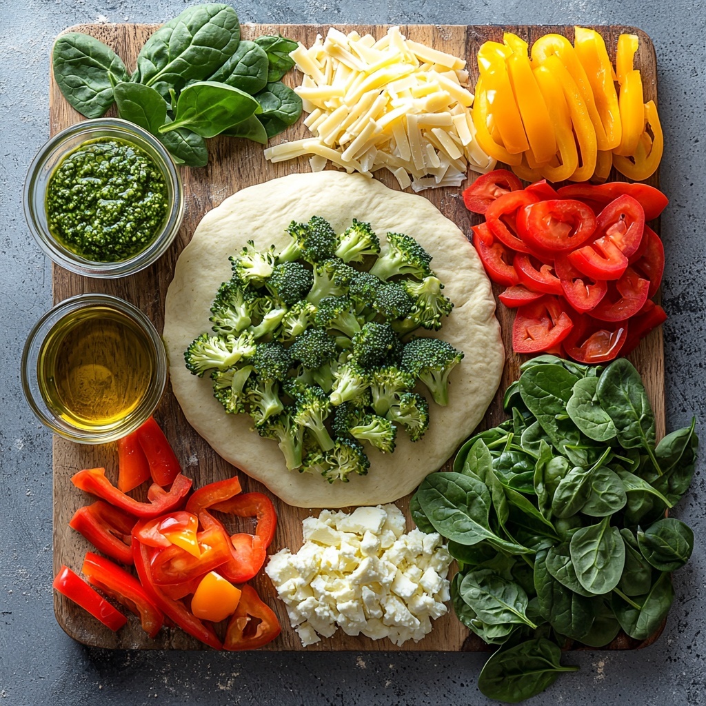- Add Vegetables: Layer fresh spinach leaves, broccoli florets, and sliced bell peppers evenly on top of the pesto sauce, distributing the vegetables so each slice has a good mix.