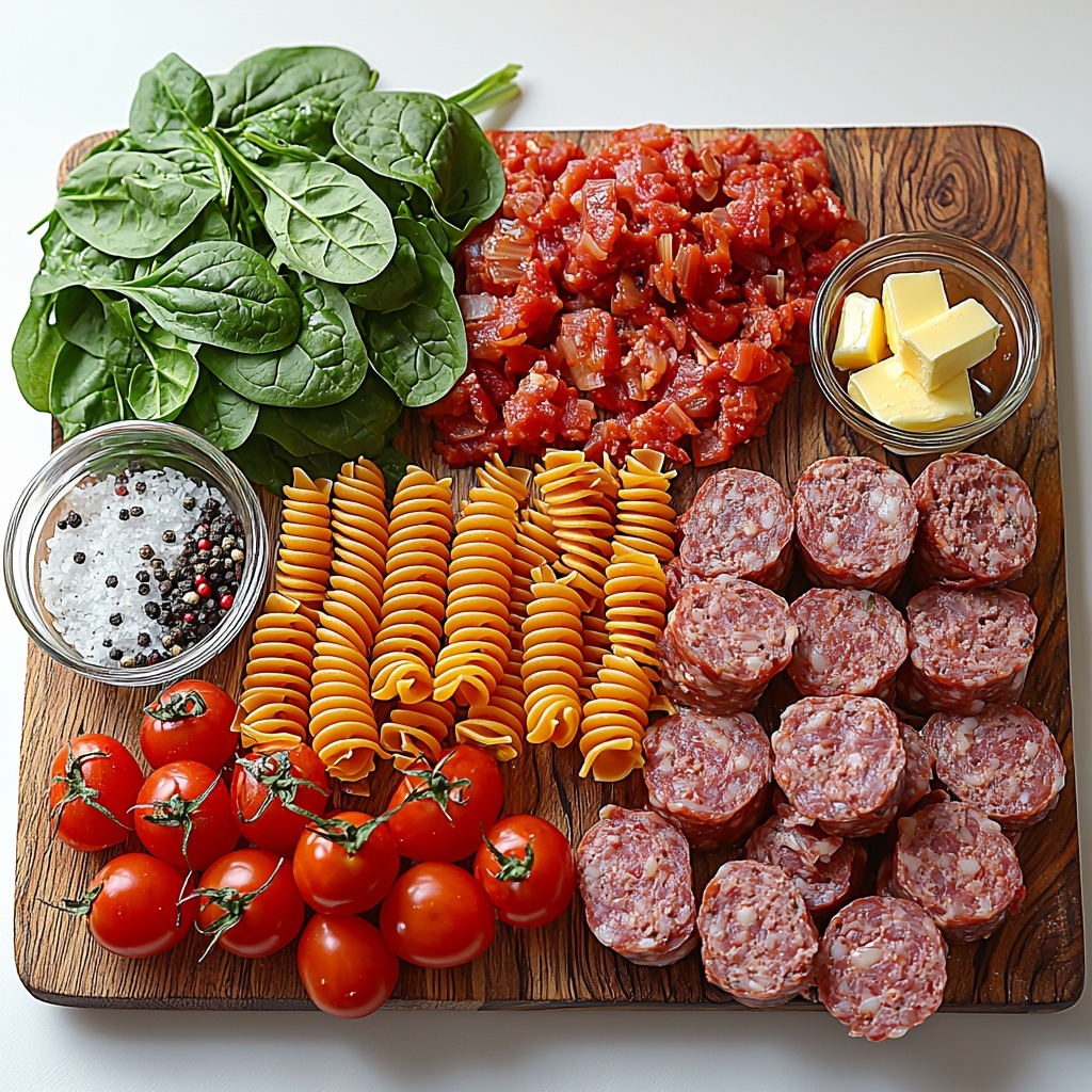 Easy Garlic Butter Rotini with Beef, Italian Sausage, and Spinach Recipe