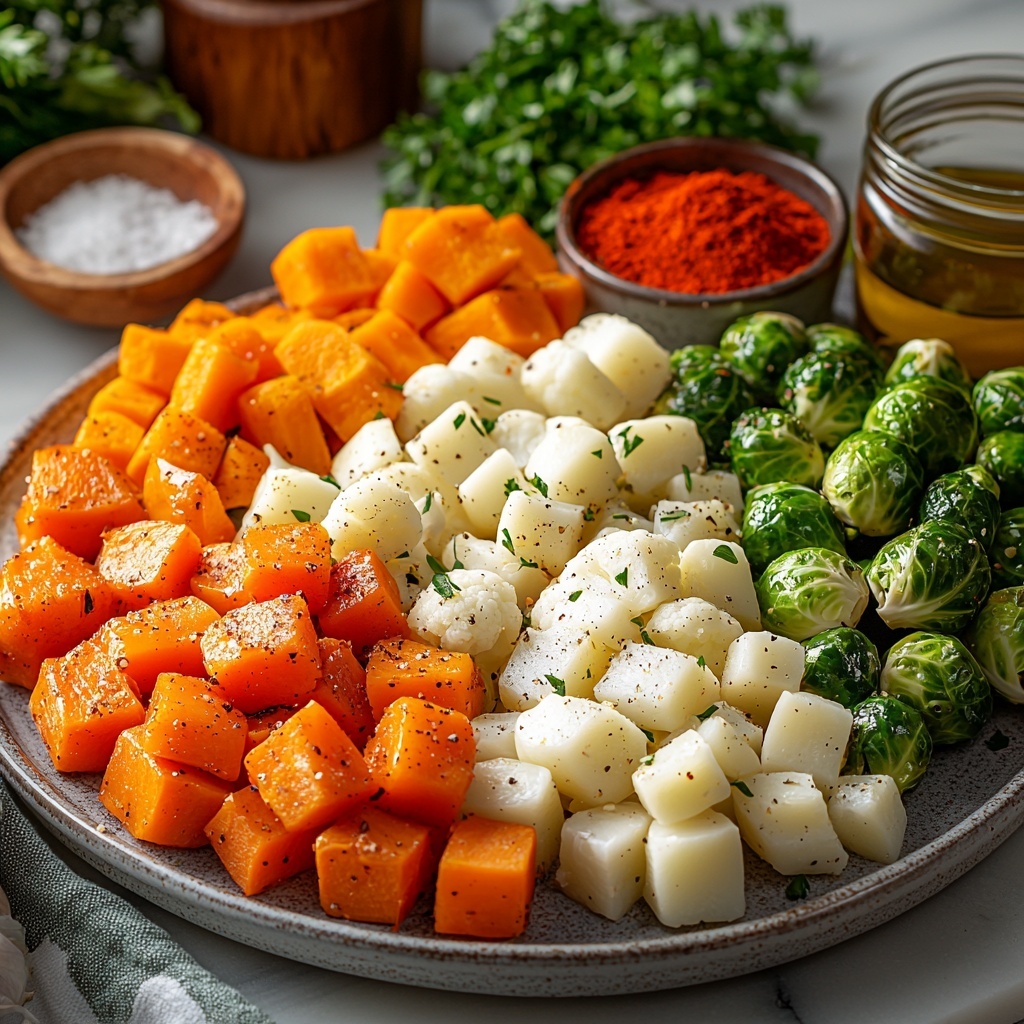 Start by choosing your favorite roasting vegetables and chopping them into evenly sized pieces so they cook uniformly. Toss the veggies in a large bowl with the olive oil, minced garlic, and dry ranch seasoning. This step ensures every bite is packed with flavor and perfectly coated for roasting.