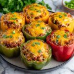 A wholesome and flavorful recipe for Easy Stuffed Bell Peppers filled with a savory mixture of ground beef, brown rice, tomatoes, and aromatic spices, baked to perfection and topped with melted cheddar jack cheese. This comforting dish is perfect for a nutritious family dinner or meal prep.