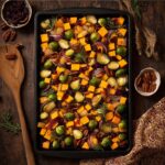 This Festive Roasted Vegetables recipe combines the natural sweetness of butternut squash, apples, and dried cranberries with the savory depth of Brussels sprouts, red onion, and aromatic spices. Finished with crunchy pecans and a touch of maple syrup, it offers a harmonious blend of textures and flavors perfect for holiday gatherings or cozy autumn dinners.