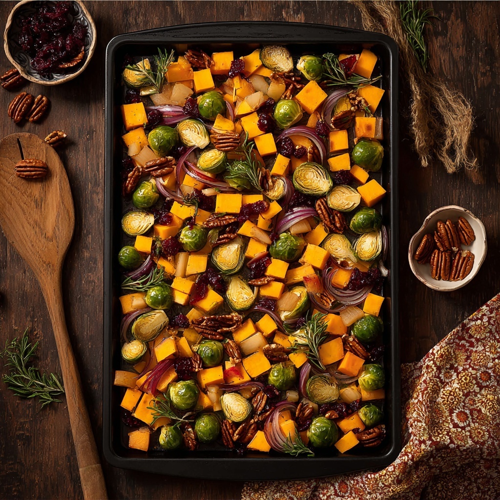 Festive Roasted Vegetables with Butternut Squash, Brussels Sprouts, Apples, and Cranberries Recipe