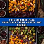 - Roast – Part Two: Scatter the chopped pecans and dried cranberries evenly over the roasted vegetables. Give a gentle toss to distribute. Return to the oven for an additional 5-10 minutes, until the squash is tender, Brussels sprouts are golden, onions are soft and jammy, and apples are sweet and glossy.
