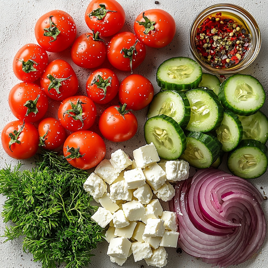 Getting the ingredients right is the secret to nailing the perfect Greek Cucumber Tomato Feta Salad Recipe. Each element is simple yet essential, combining to create a balance of flavors, textures, and colors that make this salad unforgettable.