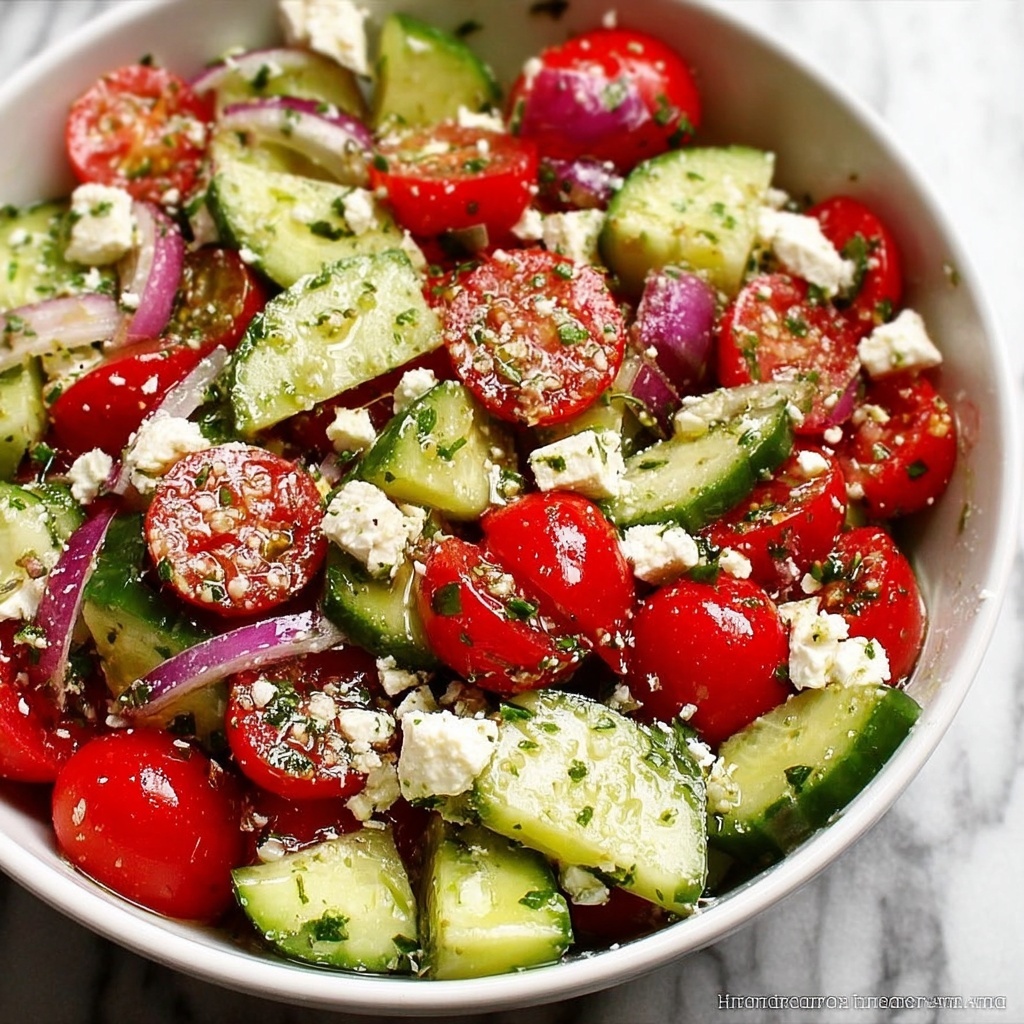 A refreshing and vibrant Greek Cucumber Tomato Feta Salad combining crisp cucumbers, juicy cherry tomatoes, tangy feta cheese, and a zesty olive oil and red wine vinegar dressing, perfect for a quick, healthy, and flavorful side dish or light meal.