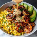 Begin with a base of rice or quinoa if you like, then pile on the grilled shrimp, creamy avocado slices, and bright corn salsa. Finally, generously drizzle your creamy sauce all over. The result is a bowl packed with satisfying textures and vibrant flavors, ready to delight your taste buds.