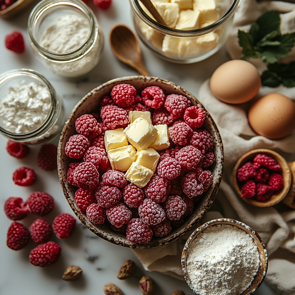 The magic in this Heavenly Pistachio Raspberry Dream Cake Recipe lies in its simple yet thoughtfully chosen ingredients. Each one plays a crucial role, from the crunchy, aromatic pistachios that bring a unique texture and flavor to the cake, to the fresh raspberries that add a burst of vibrant color and tartness. The mascarpone cream topping adds a luxurious, velvety finish that perfectly balances the nuttiness and fruitiness.