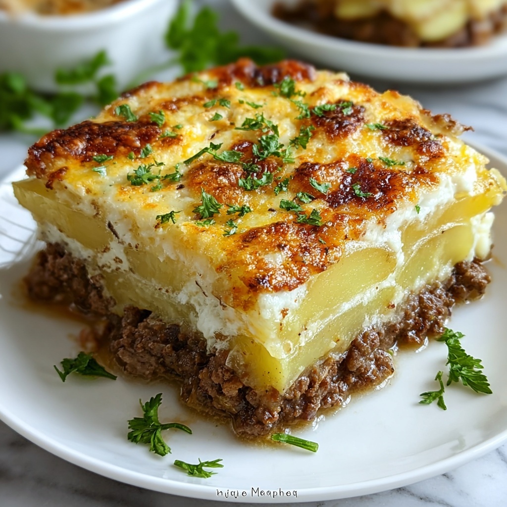 - Layer Ingredients: Spread the beef mixture evenly in the baking dish. Arrange a layer of thinly sliced potatoes on top, seasoning them with salt, pepper, Italian seasoning, and paprika for added flavor.