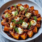 This dish features tender roasted sweet potatoes coated in a sweet and warmly spiced maple syrup glaze, topped with toasted walnuts and creamy goat cheese, creating a perfect balance of sweet, nutty, and tangy flavors. It’s a delightful side dish that combines rustic comfort with a gourmet touch, ideal for cozy dinners or festive gatherings.