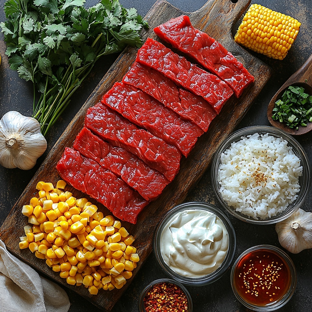Gathering the right ingredients is surprisingly simple but crucial for capturing the authentic taste and textures of this Korean BBQ Beef Bowl with Corn & Creamy Sauce Recipe. Every component plays a vital role, whether it’s the juicy beef for rich flavor, the fresh corn for sweetness and crunch, or the creamy sauce to bring that silky, tangy finish.
