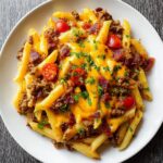 This Loaded Bacon Cheeseburger Pasta combines all the flavors of a classic cheeseburger into a comforting pasta dish. Cooked ground beef, crispy bacon, sautéed onions, and garlic blend with cheesy, creamy sauce and diced tomatoes for a hearty and indulgent meal perfect for weeknight dinners or casual gatherings.