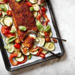 This Mediterranean Baked Salmon recipe features a flavorful tomato paste and herb topping baked to perfection alongside vibrant roasted red peppers, zucchini, and cherry tomatoes. It’s a simple, healthy, and colorful dish that’s perfect for a quick weeknight dinner or a special occasion.
