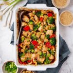 Bake the dish uncovered for 15 minutes, then gently stir to redistribute the ingredients and sauce. Return it to the oven for another 5 to 10 minutes until the chicken is cooked through, the veggies are tender but still crisp, and the sauce has thickened to a glossy coating that ties all the flavors together.