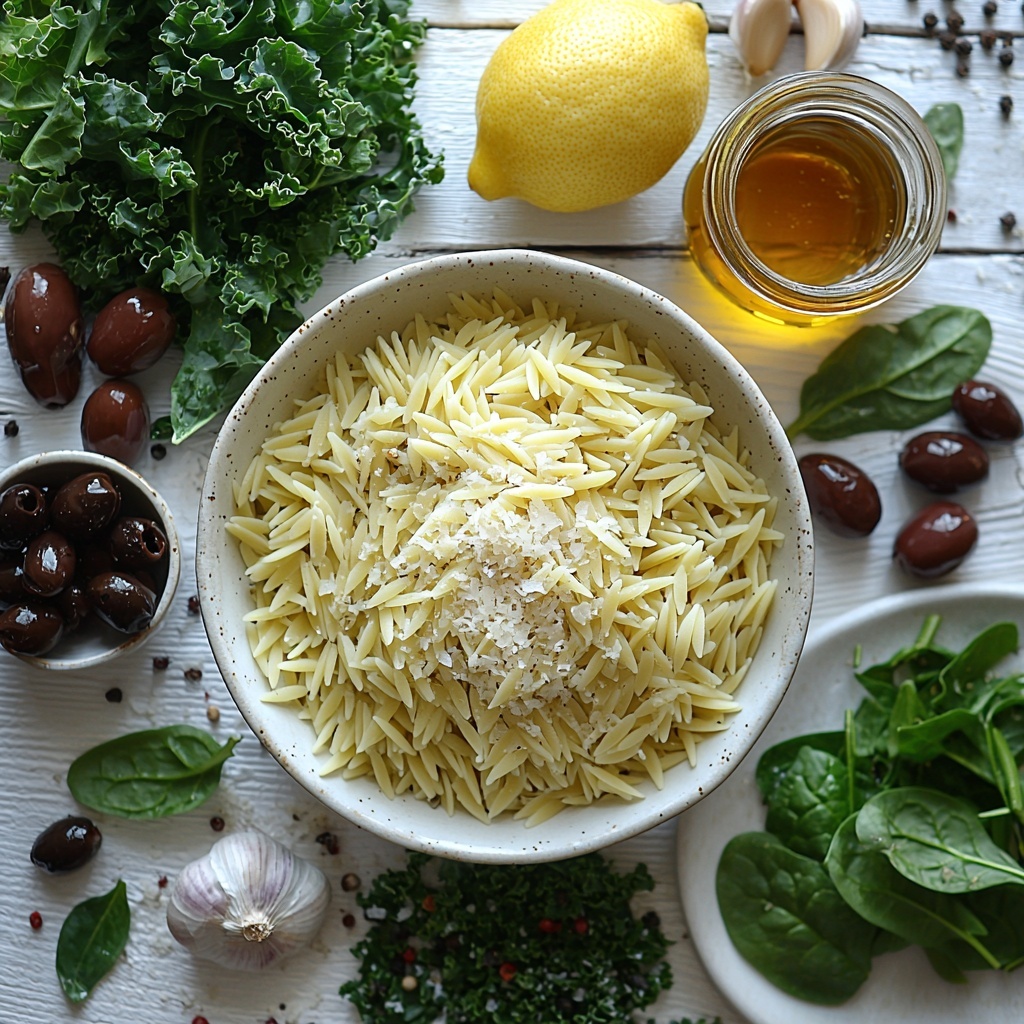 A refreshing and nutritious Orzo Kale Salad tossed with fresh spinach, shaved parmesan, pumpkin seeds, and marinated olives, all coated in a zesty lemon vinaigrette. This vibrant salad is perfect as a light lunch or a flavorful side dish, and can be served chilled or at room temperature.