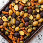 This oven roasted vegetables recipe is a vibrant and healthy medley of fresh Brussels sprouts, sweet potatoes, carrots, and baby potatoes, seasoned with a fragrant blend of fresh and dried herbs including sage, thyme, rosemary, oregano, basil, and parsley. Perfectly roasted to tender crispness, this dish makes a delightful side that complements any meal with color, flavor, and nutrition.