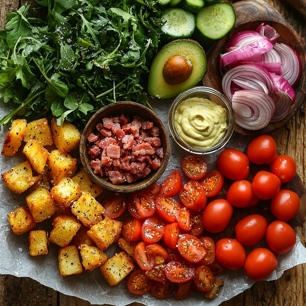 - Assemble the Bowls: In serving bowls, layer the greens of your choice, cooked ground beef, crispy bacon, roasted fries, cherry tomatoes, sliced purple onion, sliced dill pickles, and avocado slices.