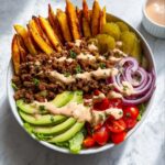 These Paleo Burger Bowls with Fries are a delicious and wholesome meal perfect for Whole30 and paleo diets. Featuring oven-roasted Russet potato fries, crispy bacon, seasoned ground beef, and fresh greens with a flavorful paleo mayo-based sauce, this bowl is a satisfying and nutrient-dense alternative to traditional burgers.