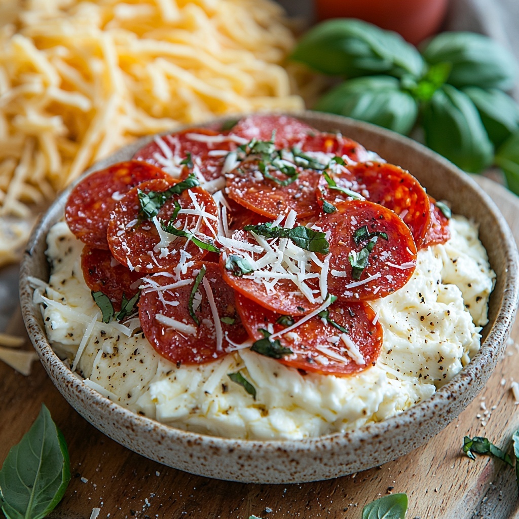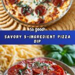 This Savory 5-Ingredient Pizza Dip is a quick and easy appetizer perfect for parties or casual gatherings. Combining creamy cream cheese, tangy pizza sauce, gooey melted mozzarella, and classic pepperoni slices, it delivers all the flavors of a traditional pizza in a cheesy dip form, garnished with fresh basil for a bright finish.