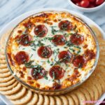 This Savory 5-Ingredient Pizza Dip is a quick and easy appetizer perfect for parties or casual gatherings. Combining creamy cream cheese, tangy pizza sauce, gooey melted mozzarella, and classic pepperoni slices, it delivers all the flavors of a traditional pizza in a cheesy dip form, garnished with fresh basil for a bright finish.