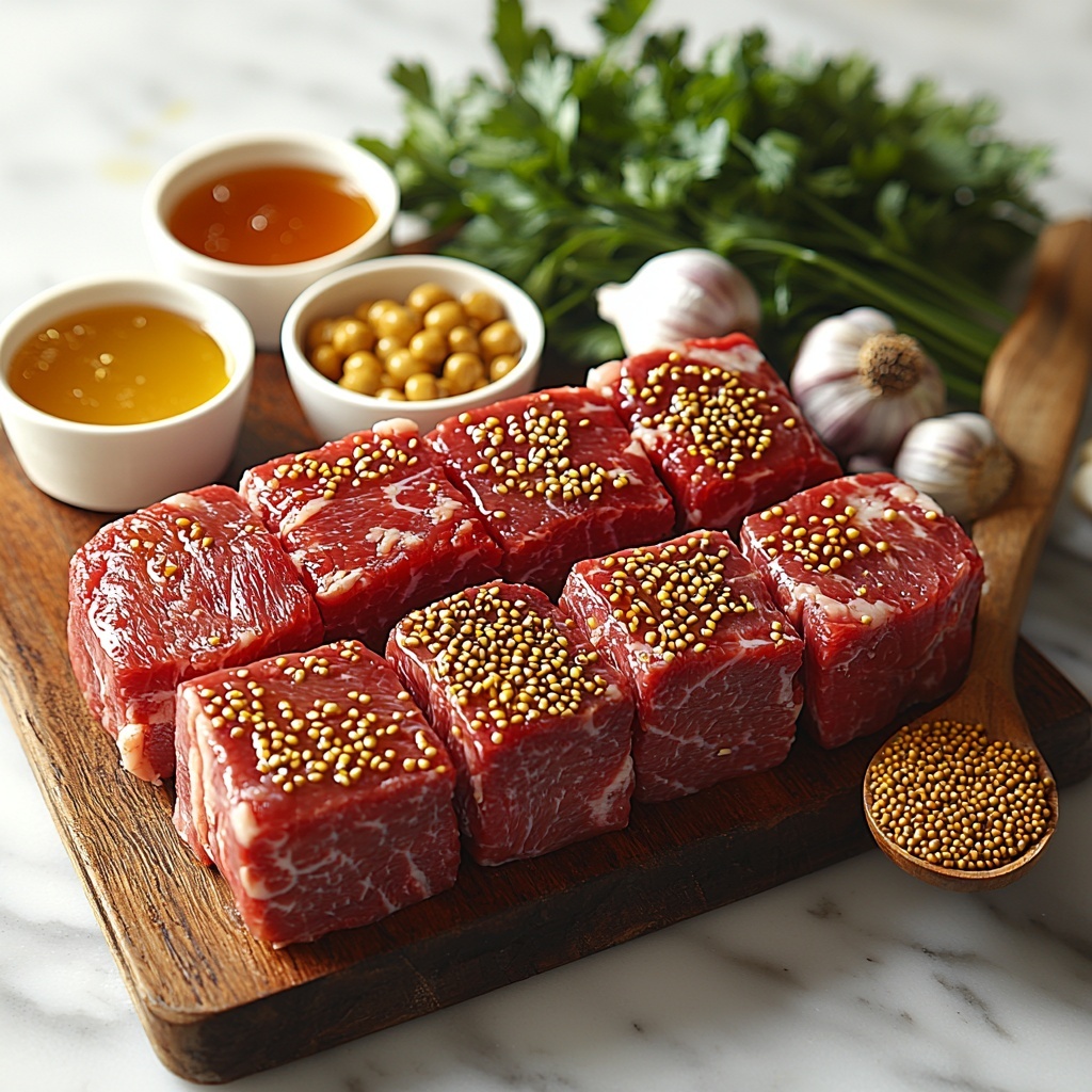 2. Prepare the marinade: In a bowl, combine the whole grain mustard, Dijon mustard, and honey. Add the smashed garlic cloves and gently fold everything together to create a fragrant marinade.