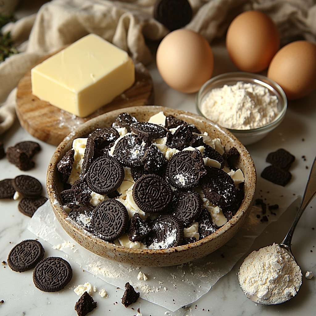 In a separate bowl, beat together the softened cream cheese, powdered sugar, and cornstarch until the mixture is fluffy and smooth. Adding sour cream brings a lovely moisture and slight tang, which keeps the filling from becoming too dense. Incorporate the two large eggs one at a time for proper binding, then gently fold in the rough chopped Oreos, giving bursts of crunchy texture throughout the creamy layer.