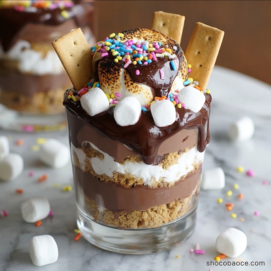 - Garnish and Serve: Before serving, garnish with broken graham crackers, mini chocolate bars, mini marshmallows, and chocolate sprinkles for added visual appeal and extra sweetness.