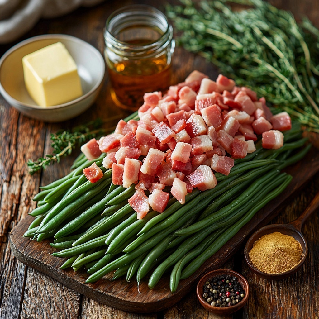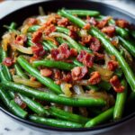 A classic Southern-style green beans recipe featuring tender green beans slow-simmered with crispy bacon, onions, and flavorful seasonings for a comforting and savory side dish.