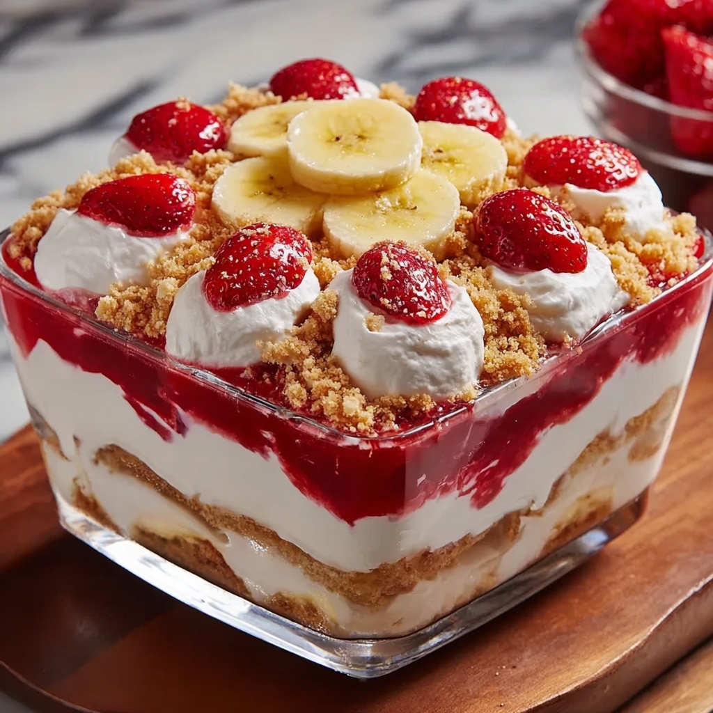 Try serving the Strawberry Banana Pudding Dream Recipe in individual clear glasses to show off those beautiful layers. You can also use mason jars or fancy trifle bowls for a charming look. For parties, consider assembling mini parfaits that guests can grab and enjoy without utensils.