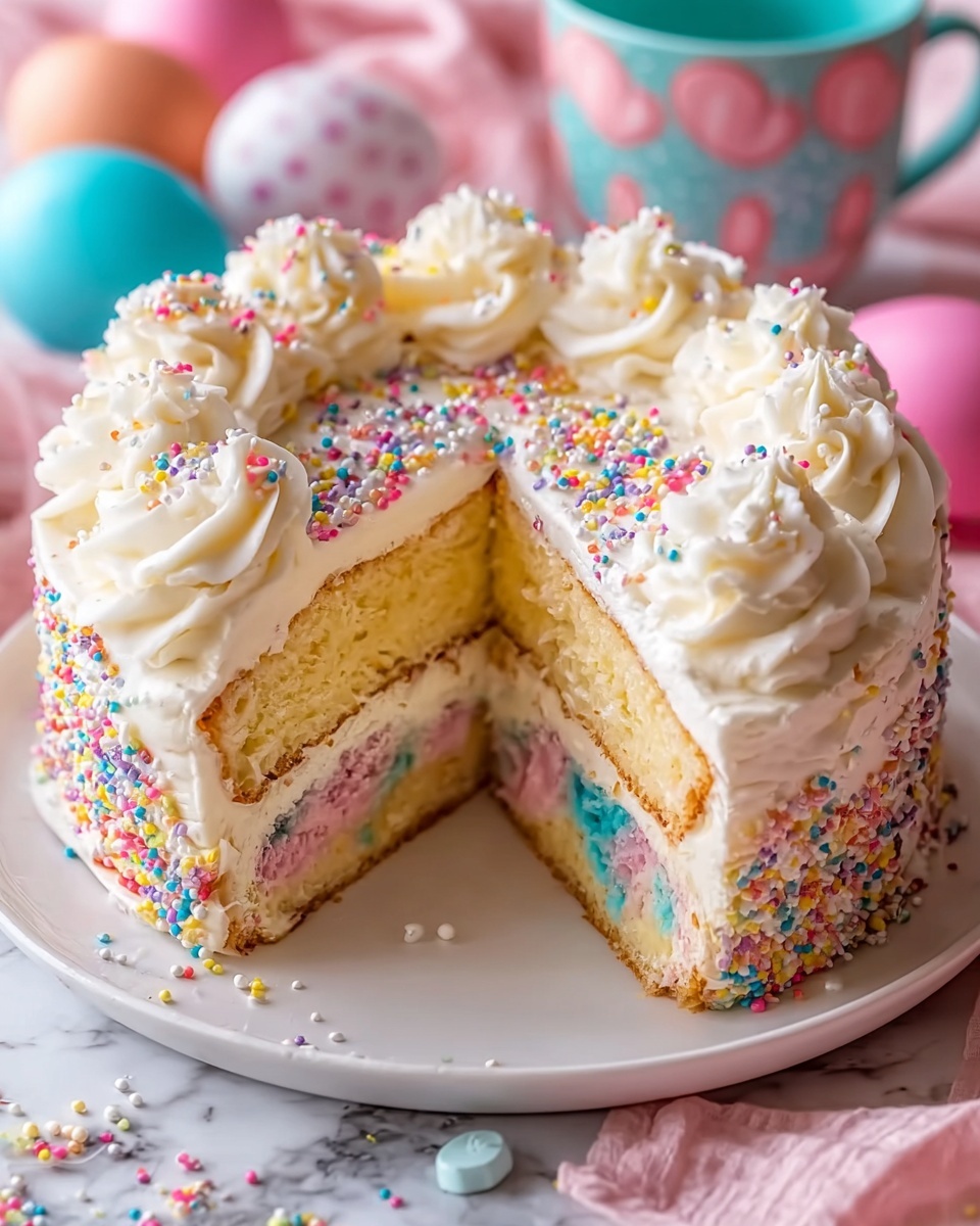 - Pastel sprinkles, Easter sprinkles, or candies: Adds a playful, colorful finish to the frosted cake.